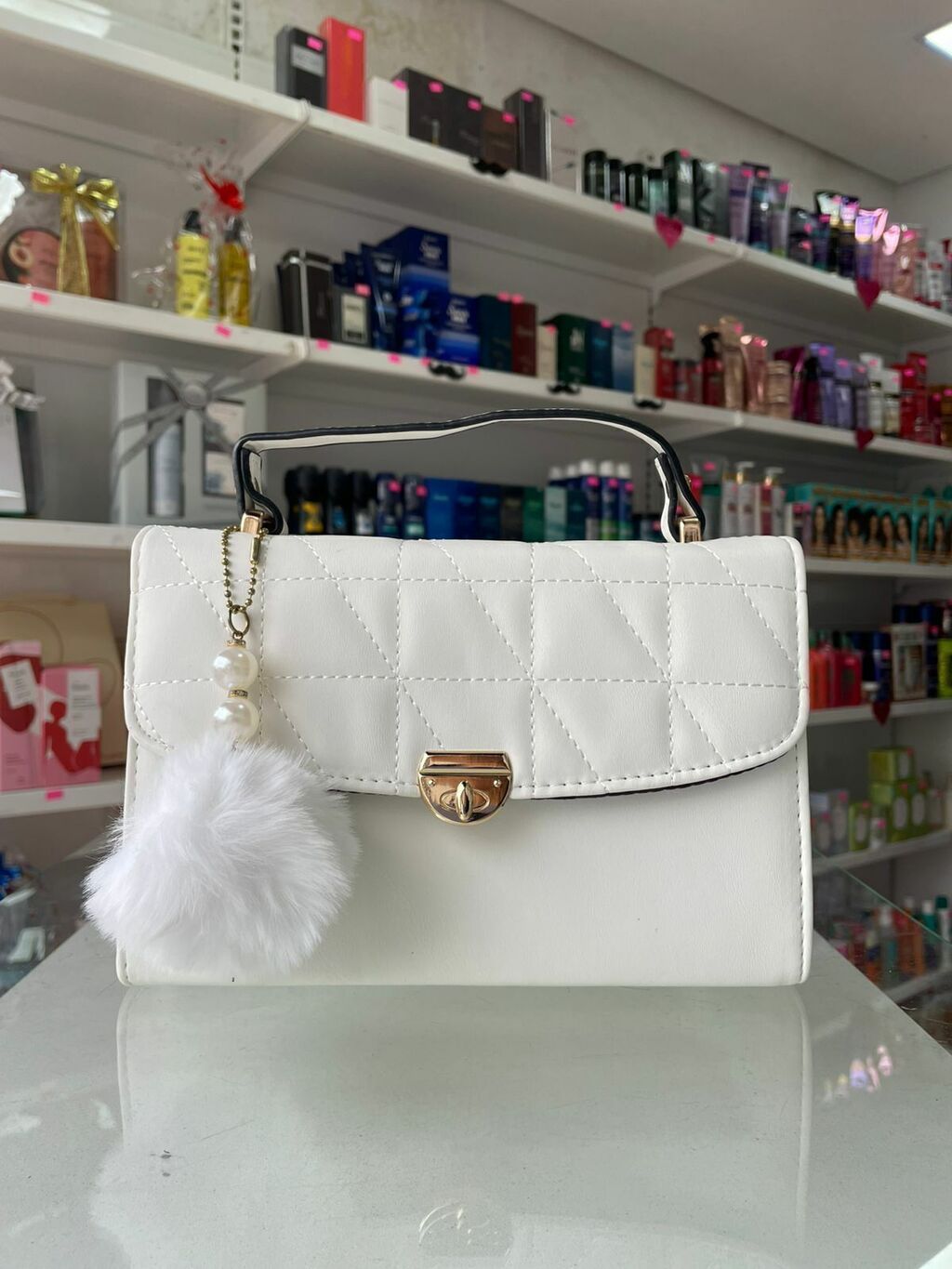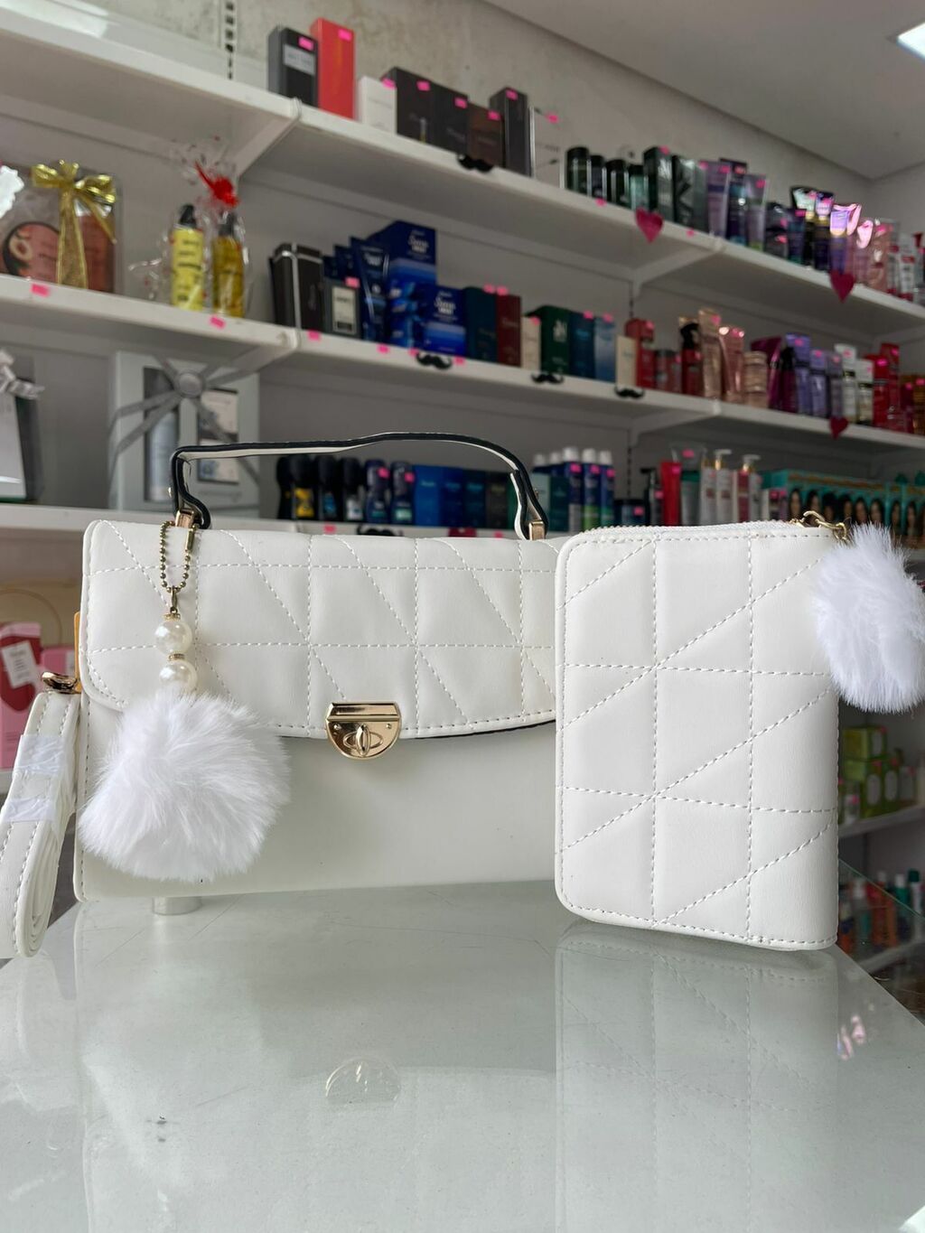 Acompanha pompom, carteira e alça transversal ajustável e removível no mesmo material da bolsa.