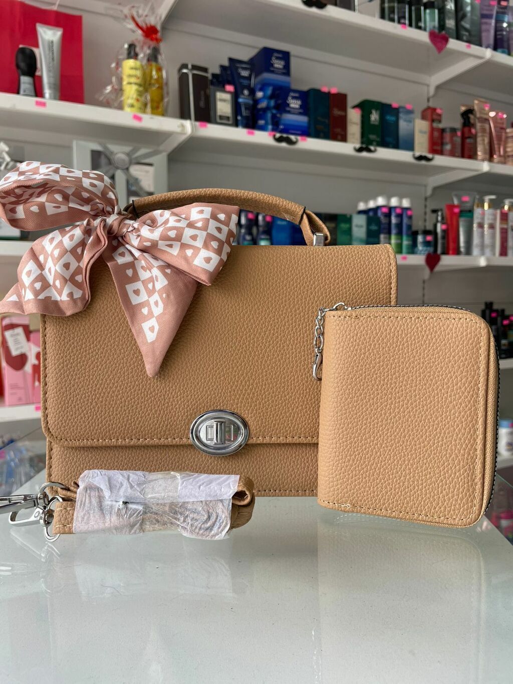 Acompanha laço, alça transversal ajustável e removível no mesmo material da bolsa e carteira.