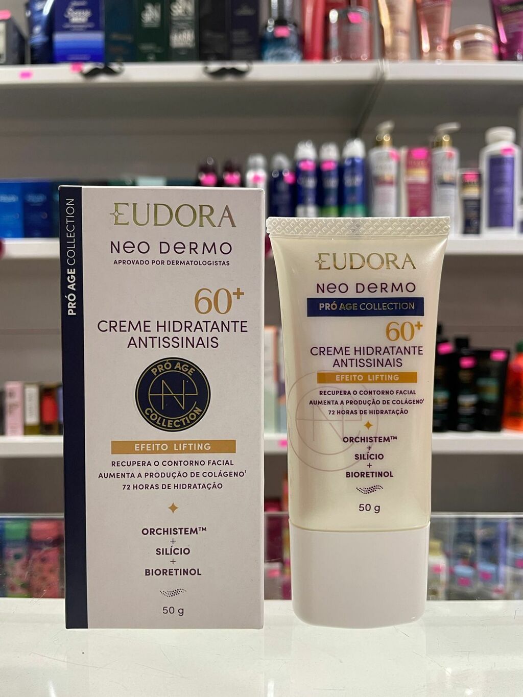 O Creme Hidratante Facial Antissinais 60+ Neo Dermo Pró Age Collection cuida da sua pele em sua nova fase da vida. Creme hidratante facial para peles a partir de 60 anos, faz parte da linha Pró Age Collection de Eudora Neo Dermo, que entrega cuidados com a pele e tratamento facial para todas as idades.