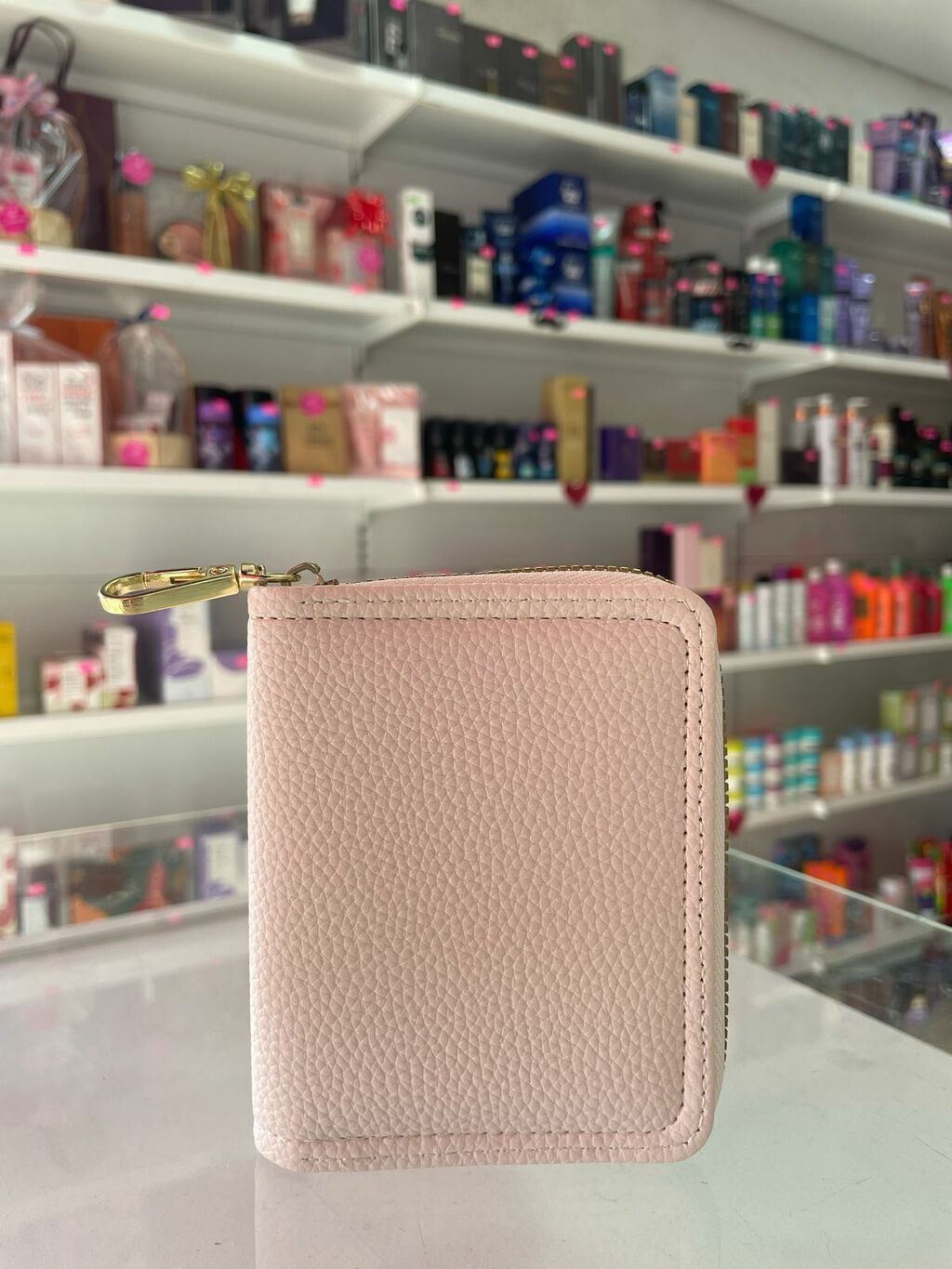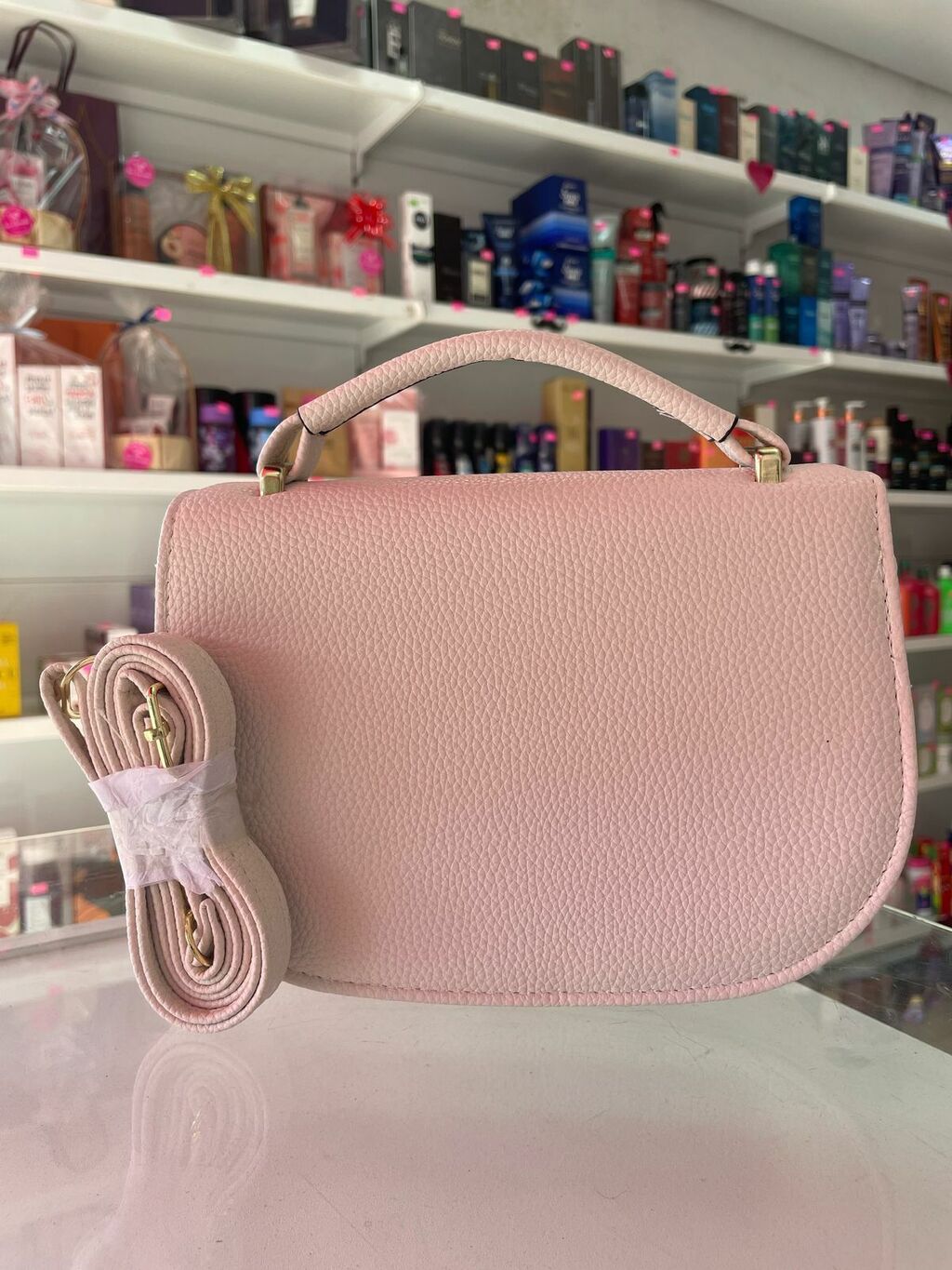 Possuí alça de mão, fecho em botão magnético e bolso interno com zíper.