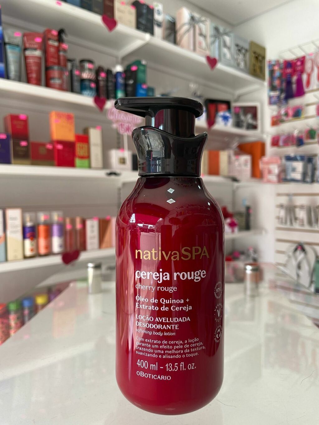 Nativa SPA Cereja Rouge, com o exclusivo acorde Sexy Cherry, você, comprovadamente mais irresistível! Nativa SPA te convida a sentir de pele e alma. É a primeira marca³ do mundo que utiliza o óleo de quinoa² para estimular a produção de colágeno na pele4”.